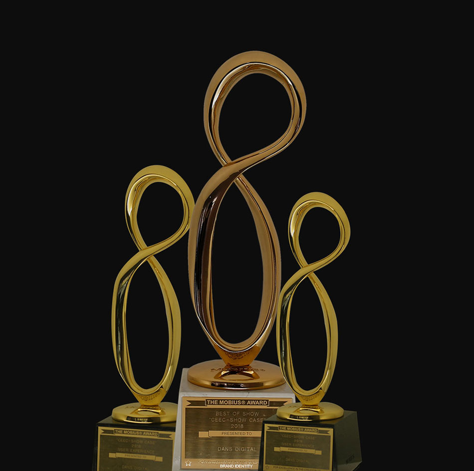 莫比國際廣告獎得名于莫比斯環,它源于19世紀一位德國科學家的發現,一張窄長的紙條一端扭轉一圈后再與另一端相連,會產生只有一個面,一條邊的奇特圓環,這就是著名的莫比斯環。在這個奇特的莫比斯環上,沒有開始,也沒有結束,運動是永恒的。一座金光閃閃的莫比獎杯意味著值得驕傲的杰出成就。它象征著永無止境的思想與信息的傳播交流。這就是莫比獎用莫比斯環做獎杯造型的含義,也是莫比獎所崇尚和傳承的真正意義。