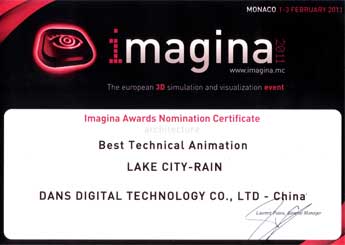 In February ,2011, the work Gemdale Lake City-Rain from Shenzhen Dans Digital Technology Co., Ltd was nominated for the best technical animation in the event. This work makes the rain which is the latest tonality its background overall . And , the profound and elegant Chinese Art Temperament and Interest stands out via the decoration of black bricks , peach blossom and water.
