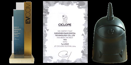 Among which, T4·Logo was made in 2 years. Still, in London, the work won the Gold Award in EVCOM Screen Award on Apr. 28, 2016, which award ceremony was held in Lindley Hall of Royal Horticultural Halls, it was the first time Chinese people won awards in this competition. And the same work won The Best VFX at CICLOPE International Festival of Craft, Dans Digital was awarded Best Digital Company in ASIA PACIFIC of CICLOPE International Festival of Craft 2014.