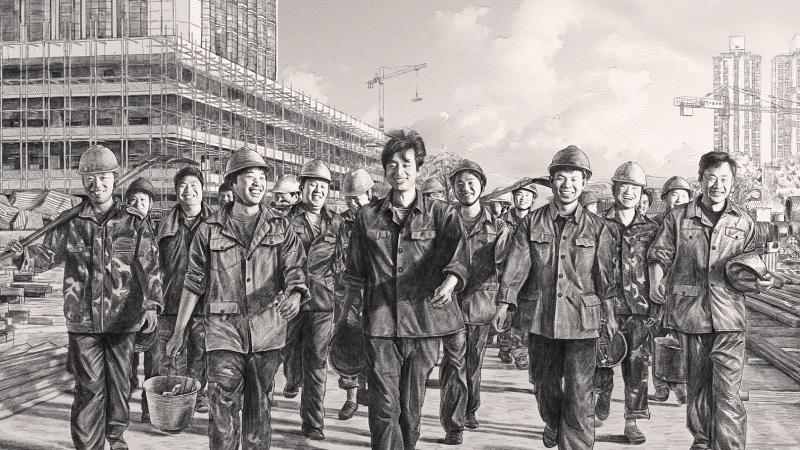在多數城市宣傳片沉迷于 “城市+人文”展現方式時,《埋頭苦干》的立意卻帶著驚人的清醒與真誠。它沒有堆砌摩天大樓的壯闊全景,沒有羅列 GDP 增長的亮眼數據,而是將鏡頭對準了 “低頭做事” 的普通人:當三天一層樓的國貿大廈成為中國第一高樓時,站在樓頂的不僅是設計師,更是千萬個被曬黑的臉龐、磨破的手掌,是工地里衣服被汗水一遍遍浸濕的建筑工人;流水線旁,女工指尖在零件上翻飛,重復的動作里藏著日復一日的堅持。影片中濃墨重彩刻畫的一張張面孔,大多是無名之輩,更是無名英雄。“去英雄化”的敘事,也讓觀眾看到了“自己的影子”。