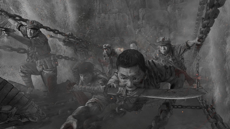 點(diǎn)石數(shù)碼運(yùn)用該電影級拍攝手法,展現(xiàn)了影片中瀘定橋、羅布泊等鏡頭。子彈時間定格戰(zhàn)士拿著武器沖鋒陷陣的姿態(tài),空中繃直的鐵索、迸濺的水霧與人物堅(jiān)毅表情形成極具張力的"動態(tài)雕塑"。
