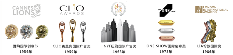 ▲世界五大廣告獎(jiǎng)(戛納國(guó)際創(chuàng)意節(jié)、CLIO克里奧國(guó)際廣告獎(jiǎng)、NYF紐約國(guó)際廣告獎(jiǎng)、ONE SHOW國(guó)際創(chuàng)意獎(jiǎng)、LIA倫敦國(guó)際獎(jiǎng))