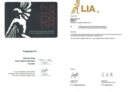 ▲鄧博弘先生受邀出任2017年LIA倫敦國(guó)際獎(jiǎng)華文創(chuàng)意單元“TV/Cinema/Online Film(影視類)”評(píng)委證書&2018年LIA倫敦國(guó)際獎(jiǎng)華文創(chuàng)意單元分類評(píng)審主席邀請(qǐng)函