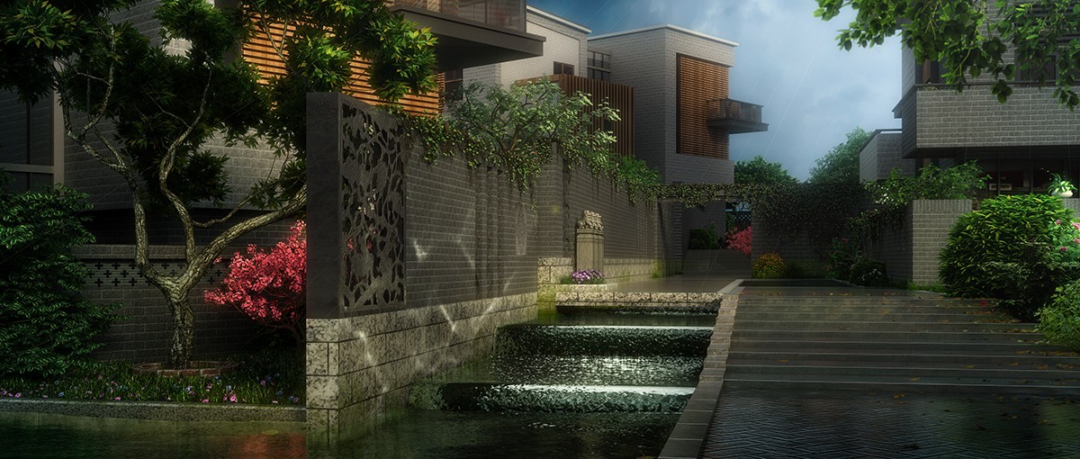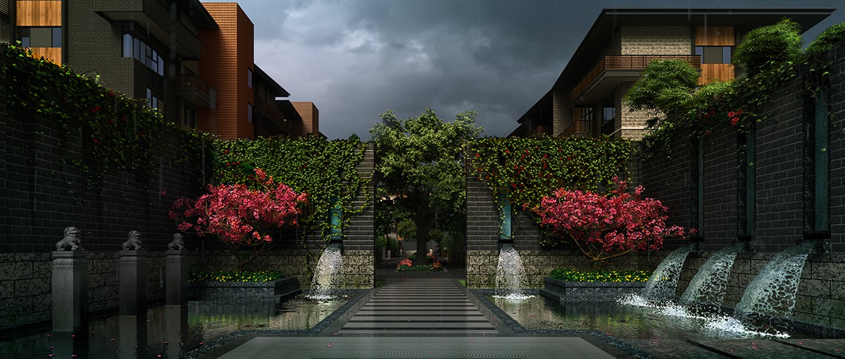 運用雨景的陰沉與植物嫩綠的色彩相輝映、凸顯建筑在陰天下的質感和設計感。并且,整個影片畫面不斷有雨滴撞擊鏡頭,巧妙的對三維場景的真實性進行了極度的提升。